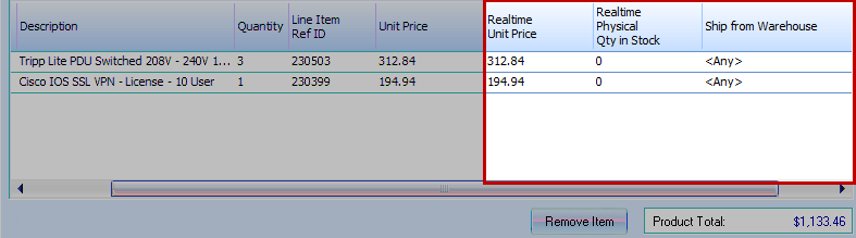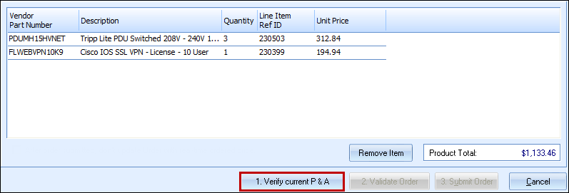 Click on the [1. Verify Current P & A] button (P & A stands for Pricing & Availability). This step accesses the D&H website in the same way the Real-Time Data module does, and returns the current pricing and availability of the line items.