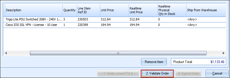 If there are any issues, you can make the changes and then click on the [2. Validate Order] button again to verify that your changes have satisfied the validation.