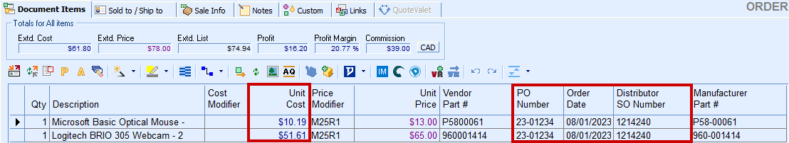 When you open a document that contains items you just ordered, you will note that the SO Number (Sales Order Number), PO Number, and Order Date columns have been updated with the Ingram Micro sales order number, PO Number, and the date of the order respectively. Also, QuoteWerks will update the QuoteWerks document Unit Cost field with the Ingram Micro ordered unit price. When this happens, the Cost Modifier value (if any) will be cleared. If the item being updated has a Price Modifier that is based on Unit Cost, the Price Modifier will also be cleared.