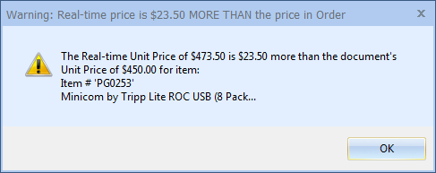 You may also receive warning notifications indicating there are pricing differences between the price on the QuoteWerks order and the real-time price. This can occur often since real-time prices change often. You are notified of this so that you are aware of this price difference. With this knowledge you can make a determination as to whether or not this is simply a small price variance or a significant price difference which would require your verification before proceeding.