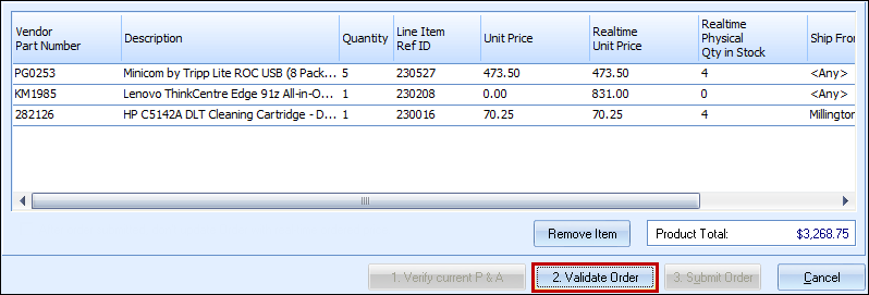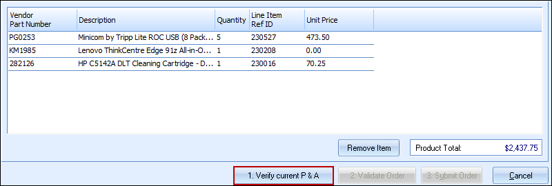 Click on the [1. Verify Current P & A] button (P & A stands for Pricing & Availability). This step accesses the Ingram Micro website in the same way the Real-Time Data module does, and returns the current pricing and availability of the line items.