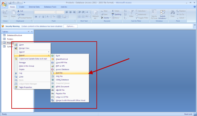 Choose “Text File” from the available list and follow the instructions from the Microsoft Access Export Wizard to complete the export.