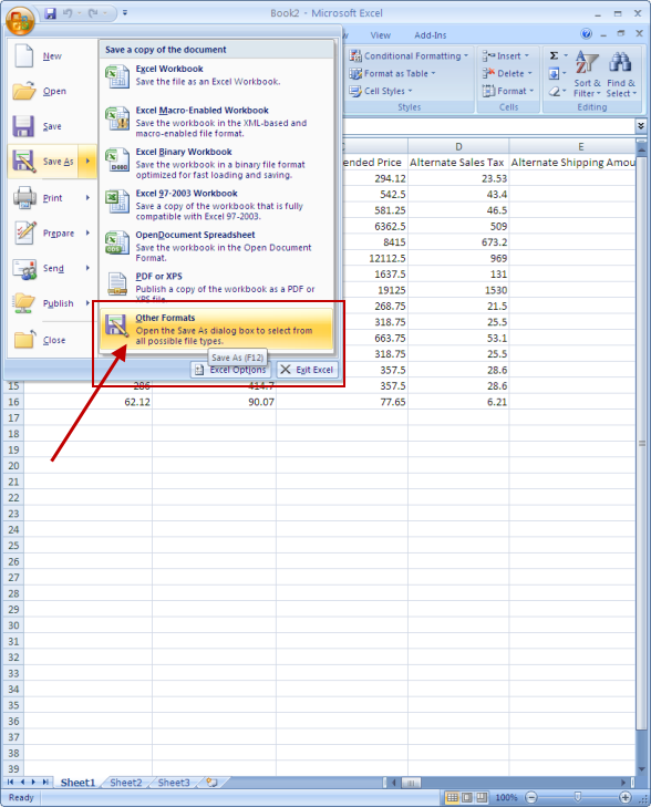 Open your Excel price list worksheet in Microsoft Excel. Select the File -> Save As menu (or in Excel 2007 and newer click on “Other Formats”: