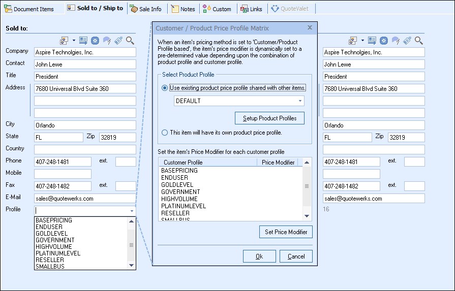 Some of the more advanced QuoteWerks pricing methods automatically select a different price for the item depending upon the customer that you are quoting the item. The 'Customer Based Price Levels' pricing model allows you to specify up to 10 different prices for the item depending upon who the customer is. The 'Based on Customer/Product profile' pricing model enables you to specify a different % discount or % margin for every combination of product and customer.