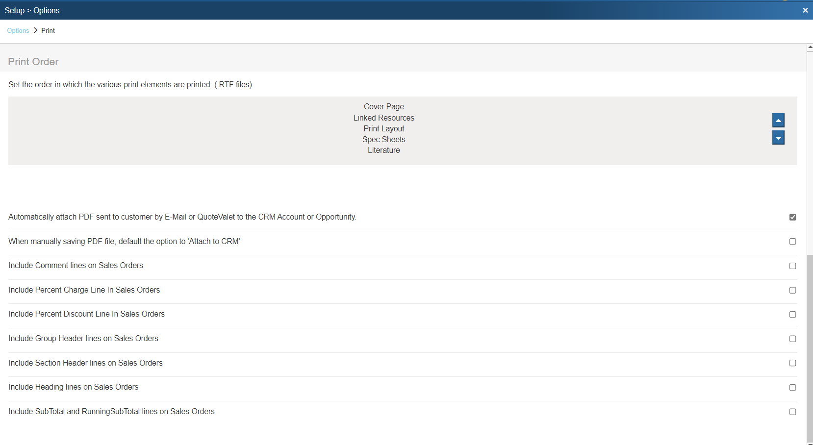 Here you can set the order in which various print elements print. For example, the default is set so the Cover Page prints first, followed by the Linked Resources, then the Print Layout, then the Spec Sheets, and then the Literature. If you wanted the Literature to print before the Linked Resources, select Literature in the window and click the up arrow to move it into place.