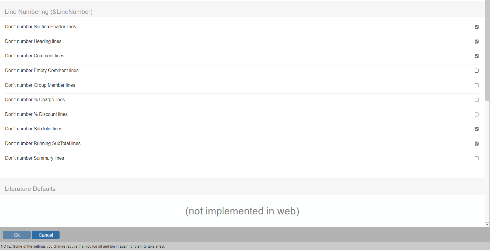 Sales Orders are internal documents that usually just have a list of part numbers on them and not all the comments and subtotals, etc used to display a quote to a customer. By default Comment, Heading, Subtotal and Running Subtotal lines are not printed on sales orders in QuoteWerks. In order for these line items to print on your sales orders, these checkboxes need to be selected.