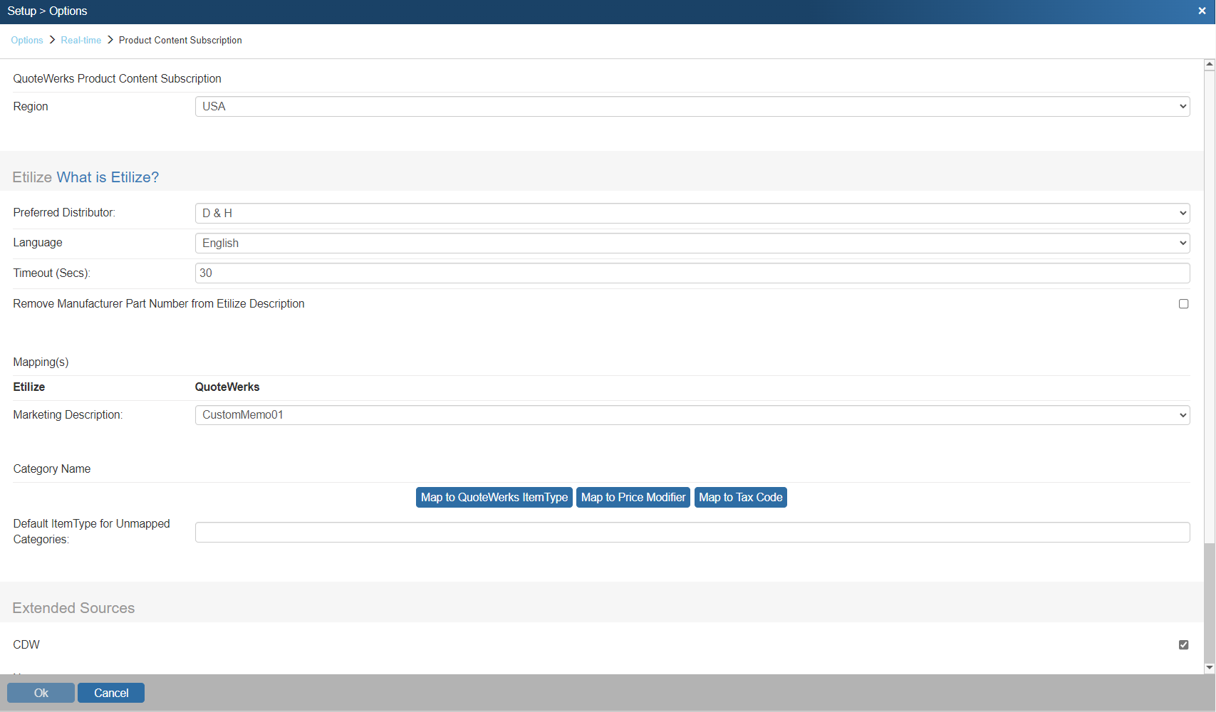 This option enables you to map your QuoteWerks tax code to an Etilize category name. For example, this allows you to set up automatic mappings to tax hardware and not tax software renewals.