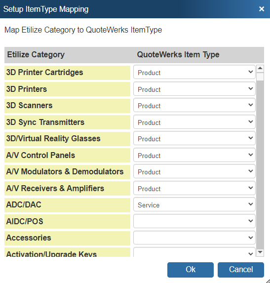 Etilize places all products into Categories. The Etilize Categories can be mapped to the QuoteWerks ItemTypes. For unmapped categories, you can set a default ItemType.