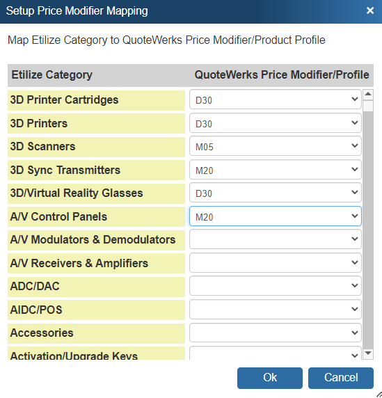 This option enables users to map the Price Modifier to an Etilize category name. If no Category Name is mapped, the default price modifer will be used (set under Tools->Options-> DocumentItems tab). This enables users to markup items such as hardware and software differently.