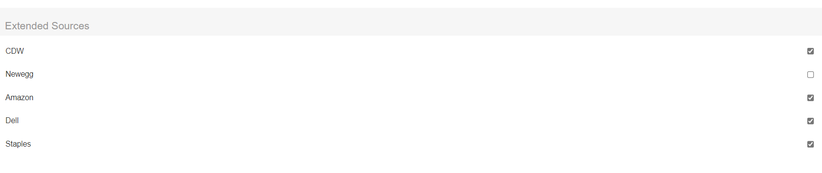 The extended sources enables users to compare prices from CDW (USA and Canada), Amazon (USA and Canada), Dell (USA, Canada and UK), Newegg (USA and Canada), Provantage, and Staples (US and Canada).