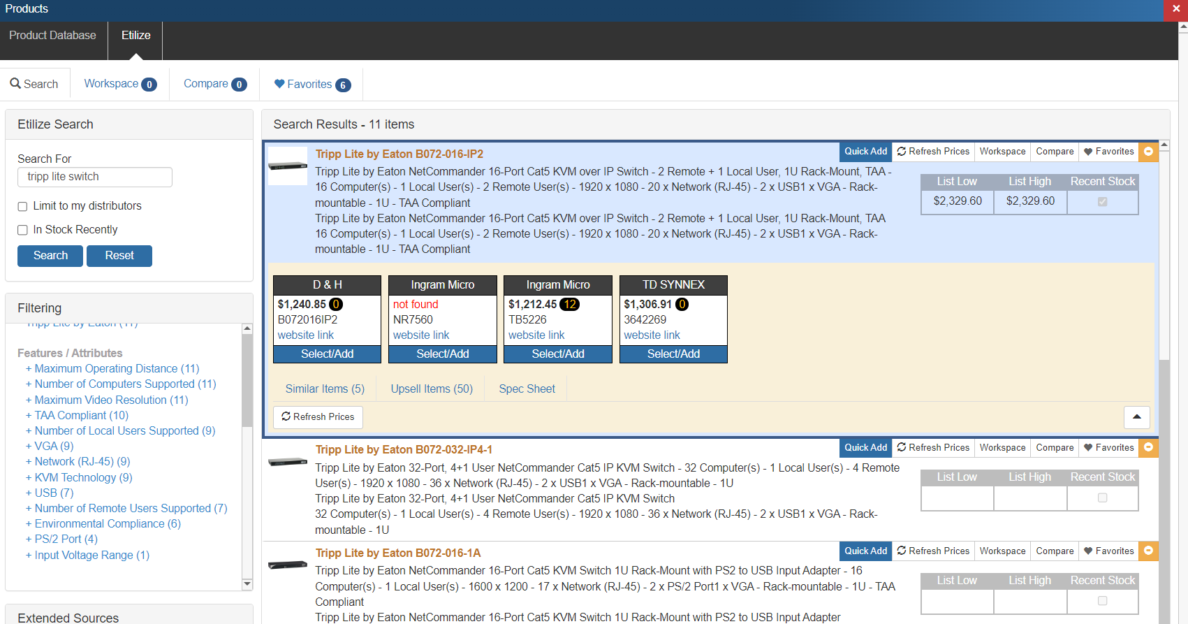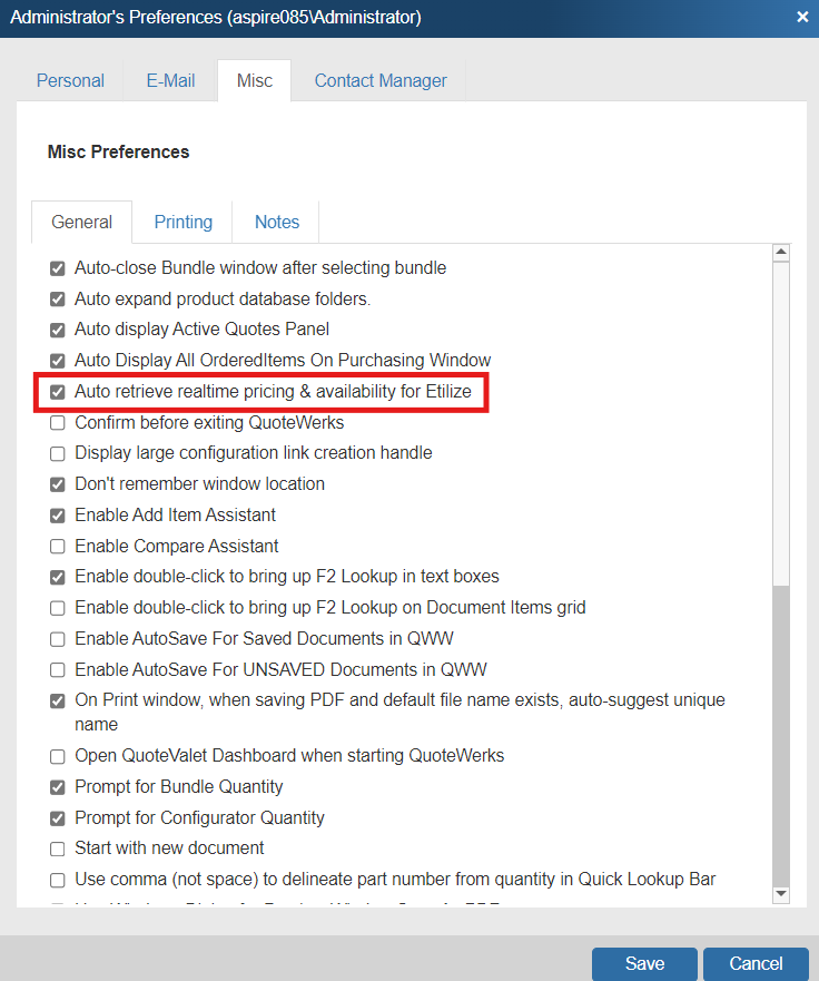 Here you can select D&H, TD SYNNEX, Ingram Micro, or None as your Preferred Distributor. When selecting a product to add from Etilize, you will be provided a list of distributors that carry the product. If the product is available from your preferred distributor, QuoteWerks will automatically select the distributor as the source vendor. If you do not set a default vendor, QuoteWerks will automatically select the first vendor in the list when an item is chosen.