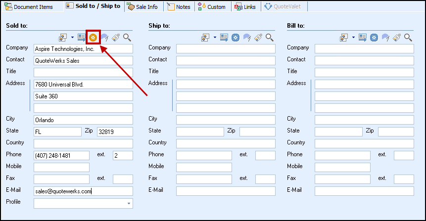 button next to the Sold to, Ship to, or Bill to boxes and the fields will fill with the contact information currently displayed in ACT!.