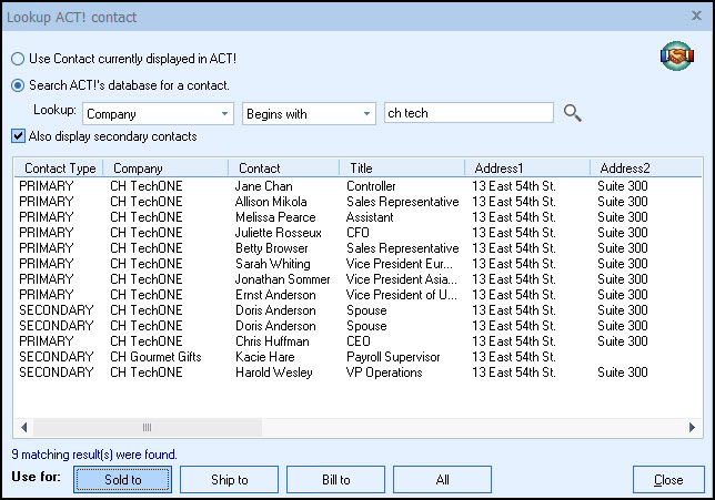 You can either use the currently displayed contact, or you can also search ACT!’s database. Once you have found the contact (or company) you are looking for, select the contact and click on the [Sold To] button to use this contact for the Sold to information. You can also select a contact and click on the [Ship To] button to use this contact for the Ship to information or you can click on the [Bill To] button to use this contact for the Bill to information. When you are finished selecting contacts, click on the [Close] button. You will be returned to the Sold to/ Ship to tab and the selected contacts will be pre-filled in the Sold to/Ship to/Bill to fields.