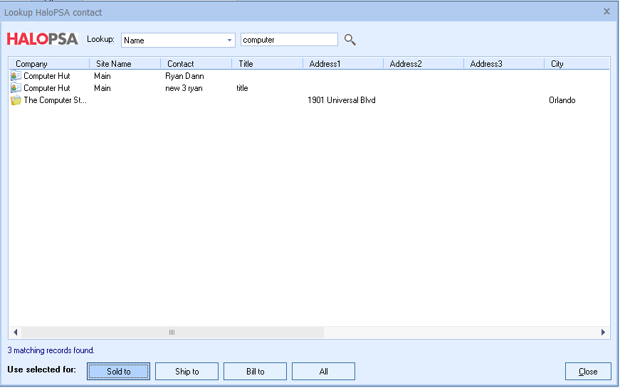 Once you have found the contact (or company) you are looking for, select the contact and click on the [Sold To] button to use this contact for the Sold to information. You can also select a contact and click on the [Ship To] button to use this contact for the Ship to information or you can click on the [Bill To] button to use this contact for the Bill to information. When you are finished selecting contacts, click on the [Close] button. You will be returned to the Sold to/ Ship to tab and the selected contacts will be pre-filled in the Sold to/Ship to/Bill to fields.