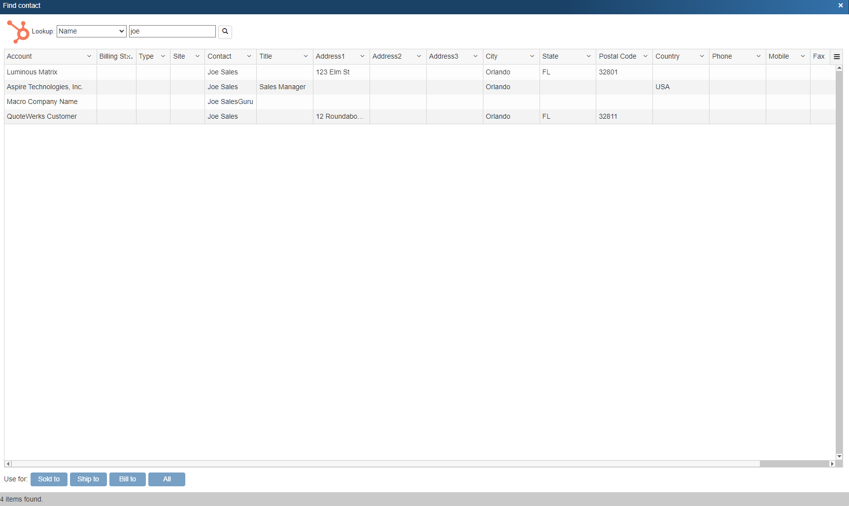 To retrieve account/contact information from HubSpot CRM into QuoteWerks, first select the Sold to / Ship to tab. Click on the  button next to the Sold to, Ship to or Bill to boxes. The Lookup HubSpot CRM contact window will appear: