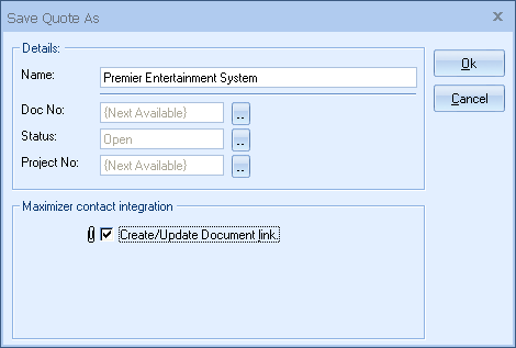 When saving a new quote, while Maximizer is running, a “Create/Update Document Link” checkbox will appear on the Save Document As window: