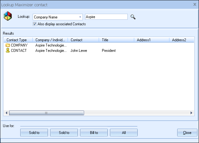 Once you have found the Company, Individual or Contact you are looking for, select the record and click on the [Sold To] button to use this contact for the Sold to information. You can also select a contact and click on the [Ship To] button to use this contact for the Ship to information or you can click on the [Bill To] button to use this contact for the Bill to information. When you are finished selecting contacts, click on the [Close] button. You will be returned to the Sold to/ Ship to tab and the selected contacts will be pre-filled in the Sold to/Ship to/Bill to fields.