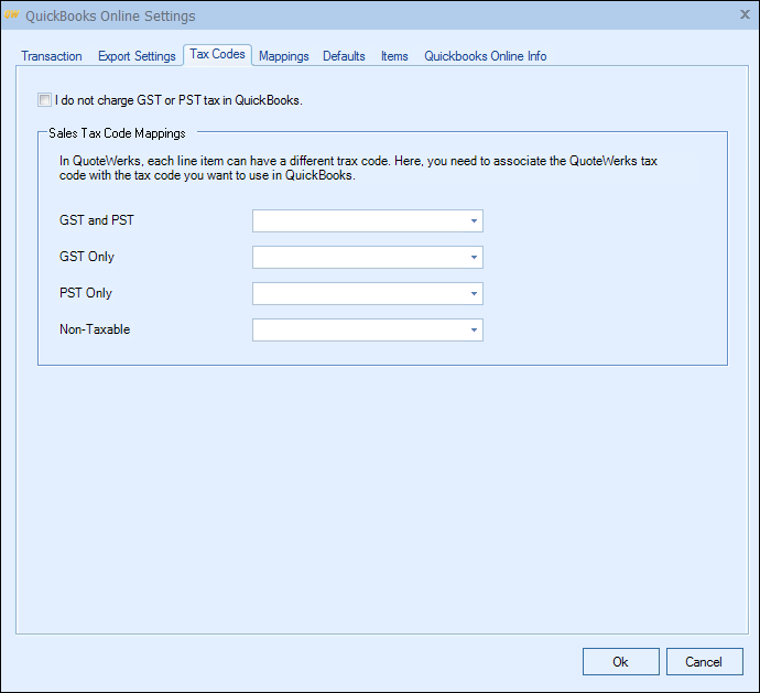 In QuickBooks Online, for each tax code, you specify a GST and PST tax rate. You need to make sure that the tax codes in QuoteWerks that are mapped to the tax codes in QuickBooks Online have the same GST and PST tax rates. If they do not, you will find that when the quote is exported to QuickBooks Online, the GST and PST calculated amounts will be different than the amounts calculated in QuoteWerks.