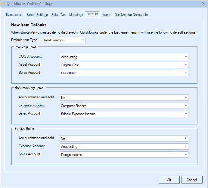 The Defaults Tab is where users can map default settings when items do not exist in QuickBooks Online and QuoteWerks is prompting the user to create them.  These are just default settings and are not required.