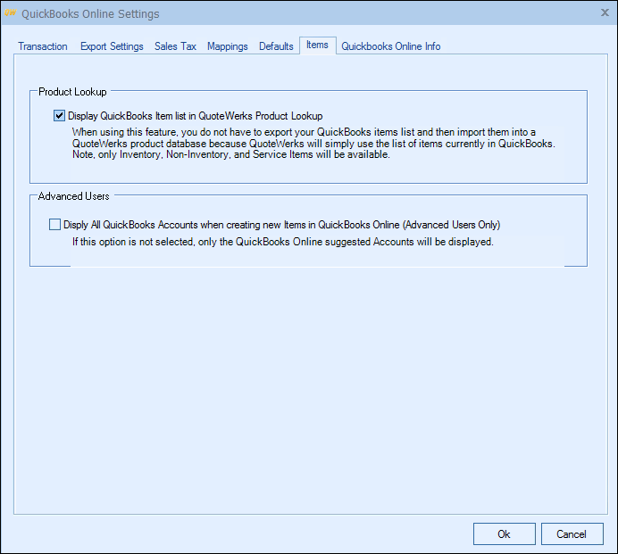 The Items Tab includes two settings. The first is for displaying items in the Product Lookup window and the second for displaying QuickBooks Accounts when new items are created.