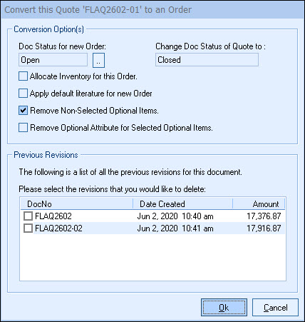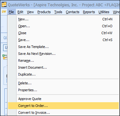 Once a customer accepts a quote, you can choose to convert the quote document to an order document. You can convert your quote to an order by selecting the File -> Convert to Order menu. Converting a quote to an order in QuoteWerks is important so that in reports you can distinguish quotes from orders. For example, you can create management reports to include only open quotes (and not orders) during the month of November. This will enable you to have a snapshot of the current quoting pipeline. |