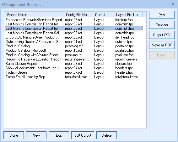 Management Reports QuoteWerks has a built-in management report designer. This designer can be used to create reports on any document or product information in QuoteWerks. You can create reports such as commission reports, outstanding quote reports, and reports on how many of a particular product you have sold. You can also create product/price catalogs for your customers (including customer-specific pricing). ![]() You will maintain and run management reports from the Management Reports window (Reports -> Management Reports menu). From this window, you can create a new report, edit an existing report, delete a report, clone a report, or preview/print a report. |