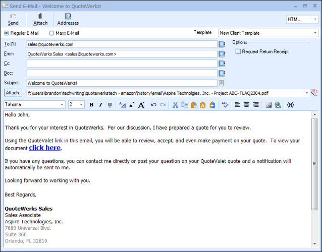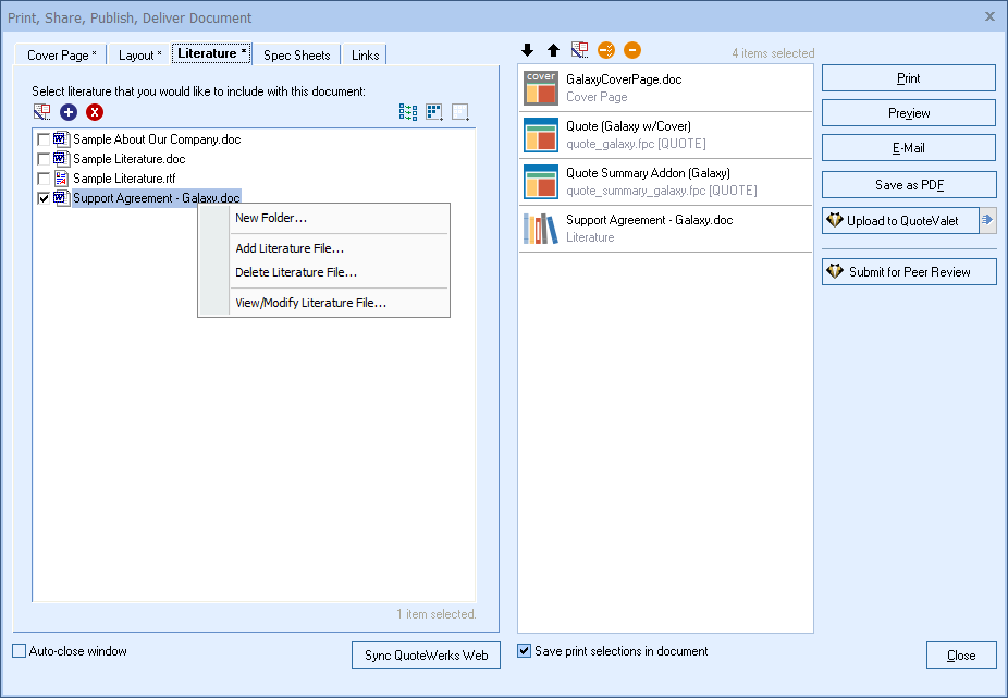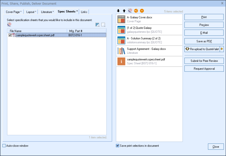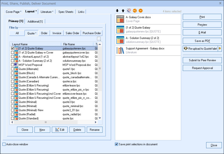 Formatting Your Quote You can customize the look of the quote in almost any way, including inserting your company logo, choosing which fields to include, changing fonts and colors, etc. QuoteWerks comes with some example print layouts that you can use as a starting point to begin customizing for your own use. When you select the File -> Print menu, the Print, Share, Publish, Deliver Document window will display. On this window, there are several tabs. The first tab is the Layout tab. Here, you can choose to print the quote using any of the layouts in the list. You may want to have different print layouts, depending in the type of quote you're printing; for example, you may want a quote that includes only services to be formatted differently from a quote that includes services and products. The Layout tab is where you can create or edit these print layouts. In addition to customizing the print layout, you can also customize and include a cover page, literature, and spec sheets. Printing Your Quote To print your quote, click on the [Deliver] toolbar button: ![]() Select your print layout from the list, and then click on the [Print] button to print, [Preview] button to preview, or [Email] to email the document. ![]() Literature Fulfillment 'Spec' Sheets When printing the quote, you also have the option to automatically print out spec sheets (formatted in RTF or PDF) for all the items that are included in the quote. 'Spec' sheets are useful for including an additional picture of the product and possibly technical details about the product that you have not already included in the description of the product as described in the quote. ![]() Sending Your Quote E-Mailing your quote couldn't be easier using the built-in QuoteWerks e-mail feature that enables you to e-mail quotes directly within QuoteWerks without using or configuring external e-mail software. You can deliver the quote using QuoteValet or send a PDF version of the quote by clicking on the [E-Mail] button. The Send E-mail window will appear, where the quote will be attached as a PDF attachment or if using QuoteValet a link to the interactive quote. You can also select multiple To, CC, and BCC recipients. QuoteWerks also supports e-mail using Microsoft Outlook. ![]() See E-Mailing PDF Quotes for more information. Send Quote with QuoteValet Users can also send an email to the customer that links to a dynamic, interactive quote where the customer can sign off on the document electronically. View the QuoteValet topic for more information about delivering documents this way. Peer Review Submit documents for peer review under the Deliver window. Peer Review enables other users to review documents and post comments about changes that should or could be made to improve the document. Document Approval Document Approvals require sales reps to obtain approval before a document can be printed, emailed, or uploaded to QuoteValet.