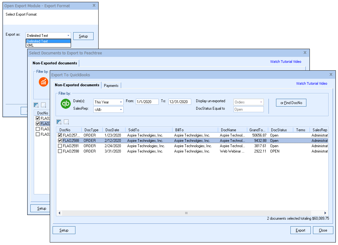 QuoteWerks Links to QuickBooks and Sage 50 (Peachtree) The Professional edition of QuoteWerks includes links to the accounting software programs of QuickBooks and Peachtree, and also has an Open Export Module that can be used to export QuoteWerks orders to other accounting software. These links are designed to further save time by eliminating the need to re-type order information. Using the QuickBooks Desktop Integration Using the QuickBooks Online Integration Using the Sage 50 US (Peachtree) Link ![]() If You don't Use QuickBooks or Sage 50 (Peachtree) for Your Accounting... You can use the Open Export Module to export quotes, orders, and invoices out of QuoteWerks into your choice of the industry-standard formats of delimited text or XML. 3rd Party Accounting Add-Ons are products written by other companies that integrate with QuoteWerks (using the QuoteWerks SDK) to provide a more complete solution. Developers have written links to Sage Line 50, Great Plains, Sage Pro Series, and more. |