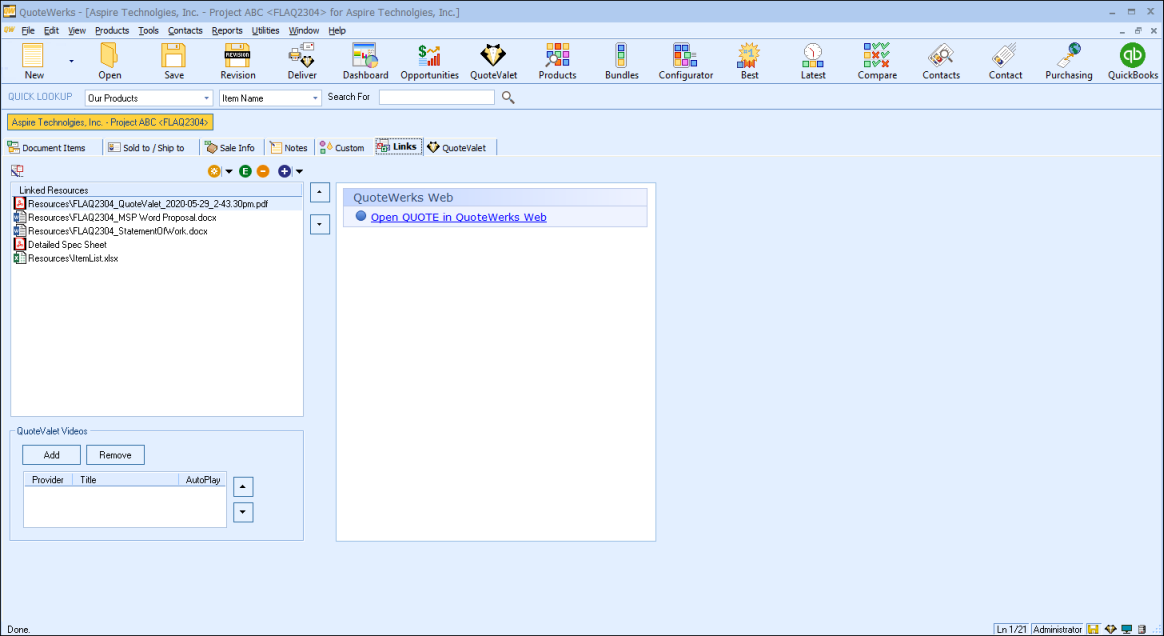 With all the external files related to the quote document displayed under the Links tab, finding and opening them to edit or print is very easy — just open the QuoteWerks quote and click the Links tab. You'll notice that all these files are organized for you.