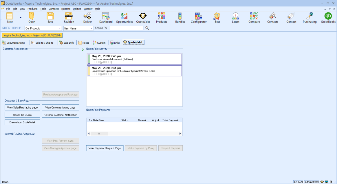 From this tab, users can also convert the quote to an order or invoice and also download the acceptance package if the quote has been accepted.