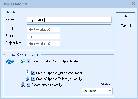 To save your quote, click on the Save button on the QuoteWerks main toolbar. ![]() Document Name You can also give the document a more descriptive name that will help you when referencing the it. For example, you can include the company name, project description, and date in the document Name field. Having all of this information in the name will make it easy to identify the content of Quotes when scrolling through a list of them. Document Number When you save a new quote, a unique Doc No is automatically assigned to your quote. Document Status You can set the current status of the quote using the Status field. Writing Back to Your Contact Manager |