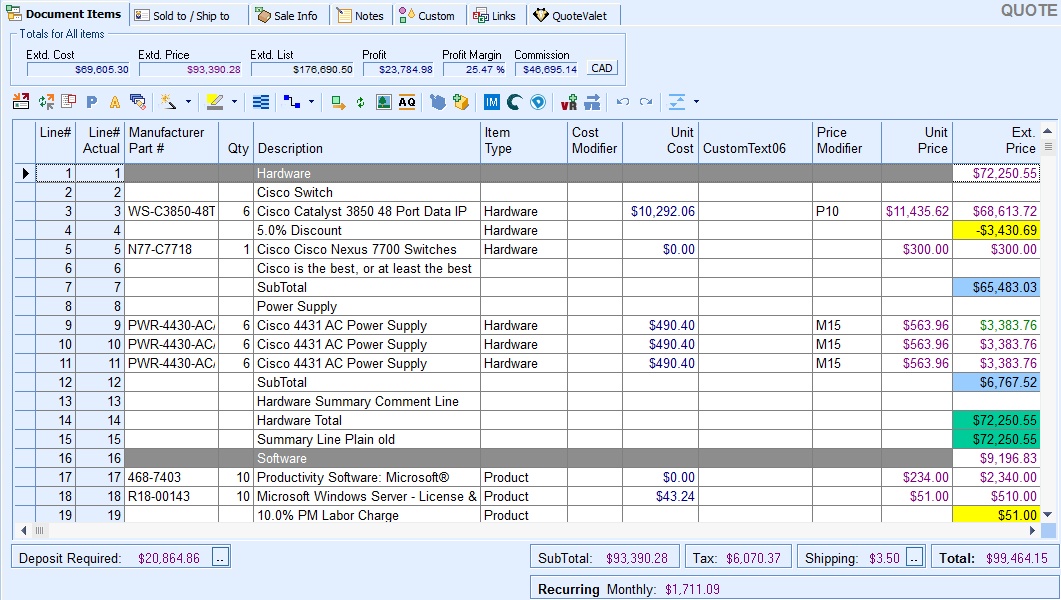 All the products/services added to the quote are listed under the Document Items tab of the Quote Workbook. Once the items are in the quote, changes can be made to each of the line items. You can change almost any aspect of every item such as quantity, description, cost, price, etc.The quote totals are always automatically recalculated when you make changes and they are displayed at the bottom of the quote. You can also select one or several of the items on your quote to see their individual totals, costs, profit, commission, etc. ![]() Once the items are in the quote, you can change each of the line items. You can change almost any aspect of every item, such as quantity, description, cost, and price. Totals for All/Selected Items Tax Code You can specify the tax code for each item.