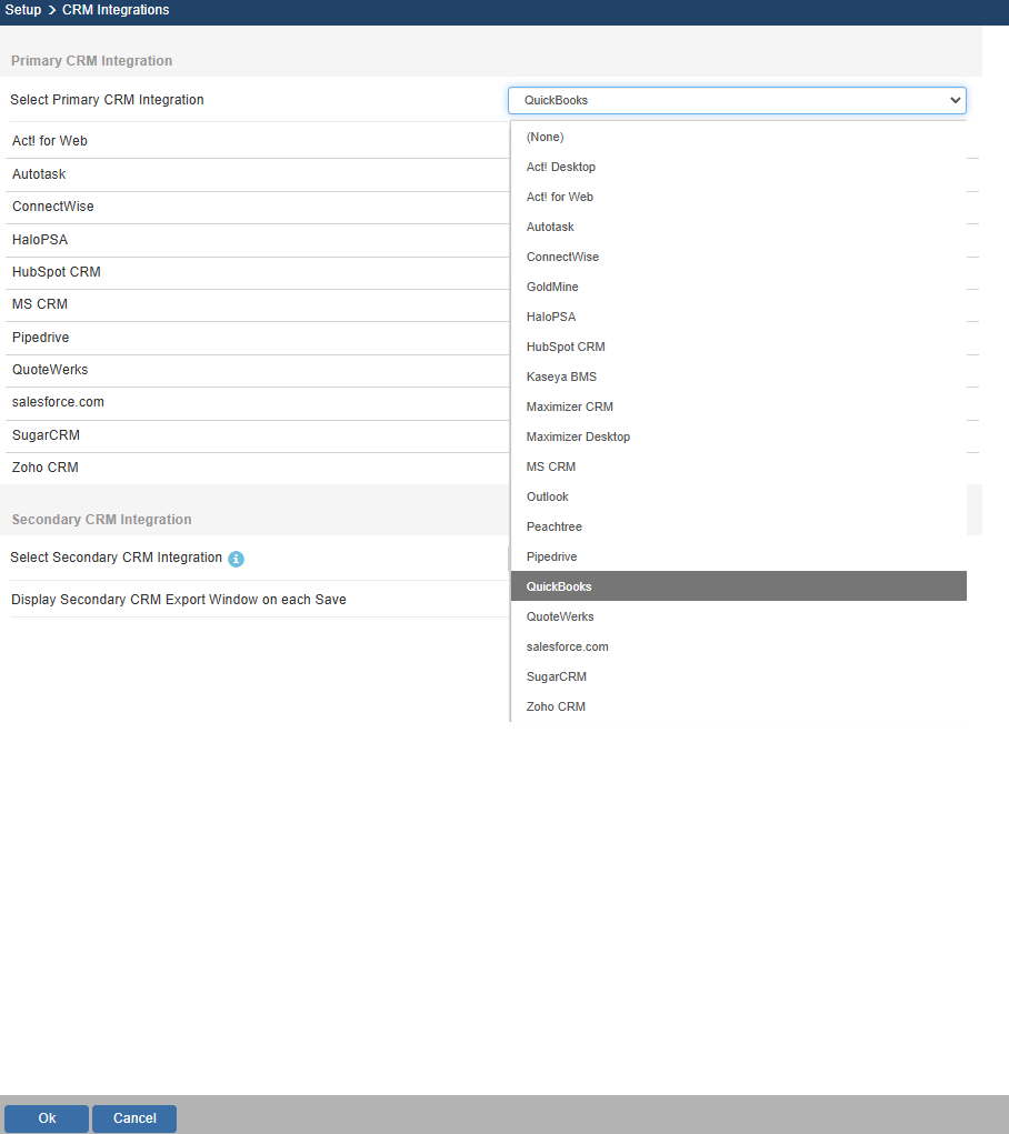 Select the Contacts -> Setup Contact Manager menu to choose your contact manager. Select the QuickBooks option: