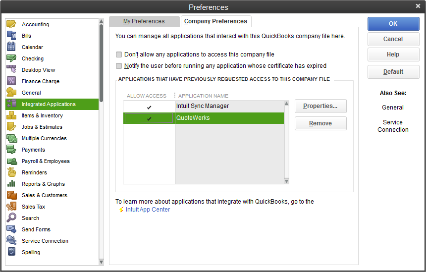 To remove QuoteWerks access rights from QuickBooks, go to the Edit -> Preferences menu. Select the ‘Company Preferences’ tab and the ‘Integrated Applications’ icon from the list: