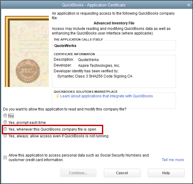 When an external application attempts to access QuickBooks, QuickBooks will prompt you to grant access to the application. The integration between QuoteWerks and QuickBooks is no different. The first time QuoteWerks communicates with QuickBooks this access will need to be granted to QuoteWerks.