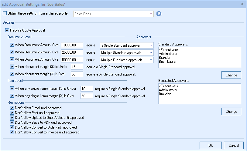 With the Approval Requirements feature you can require that your sales reps obtain approval from you before a quote can be printed, emailed, or uploaded to QuoteValet.