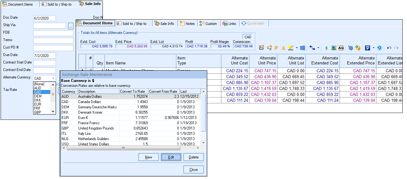 QuoteWerks can automatically display the prices in the quote in both your base currency and a foreign currency. Foreign prices are calculated using an exchange rate table in QuoteWerks. This is useful when presenting quotes to other countries in their native currency. You can easily switch between the different foreign currencies simply by selecting the foreign currency that you would like to use and you will immediately see the prices in the quote changed to the foreign currency.