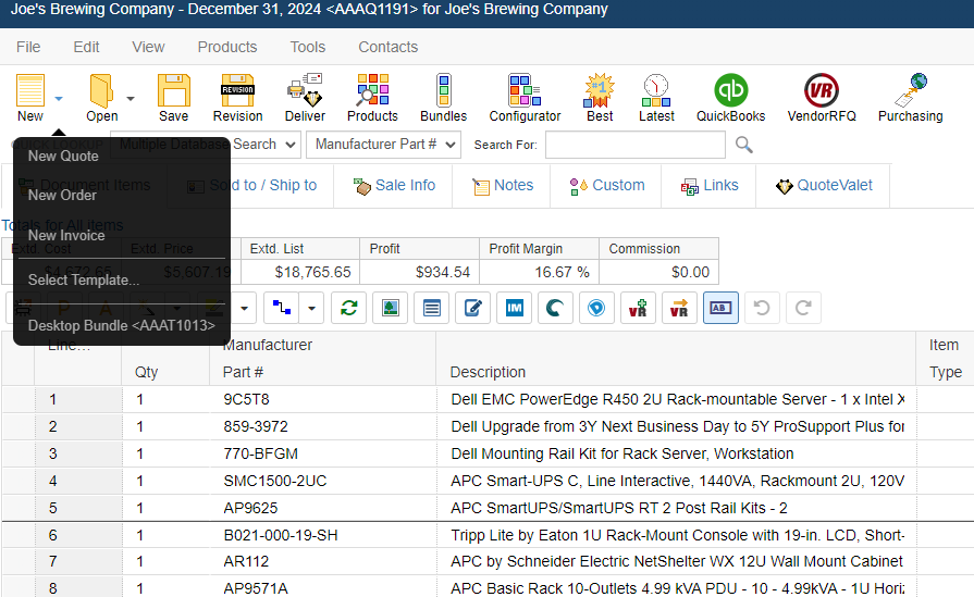 Quotes are the most commonly used type of document in QuoteWerks. When you create a new document by selecting the File -> New menu, by clicking on the [New] button on the icon toolbar, or by clicking on the split-menu arrow drop-down and selecting New Quote, a quote type of document is created. Quote documents have their own automatic numbering sequence.