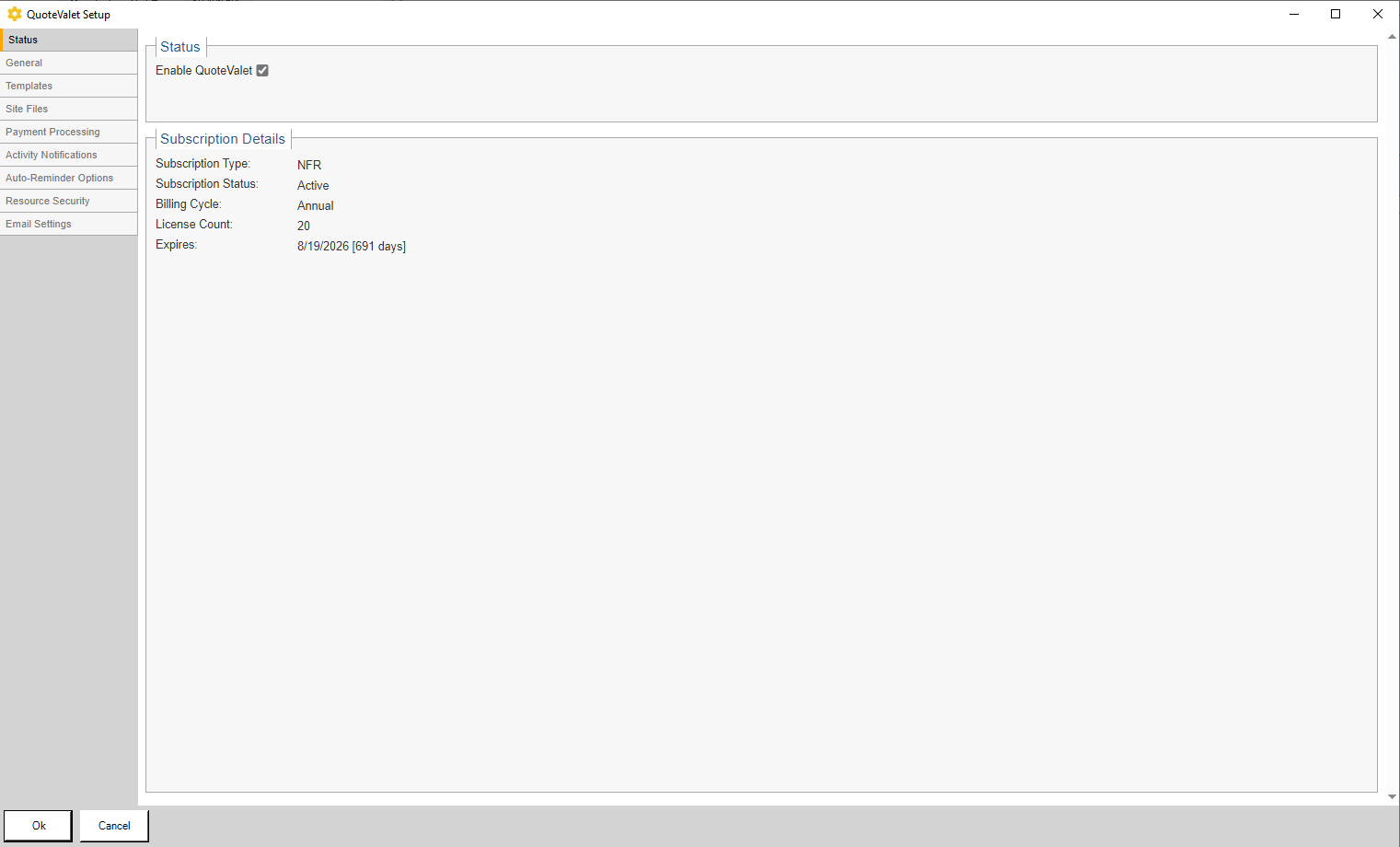 The QuoteValet Status tab is where you can go to enable or disable QuoteValet and review your Subscription Details as seen below.