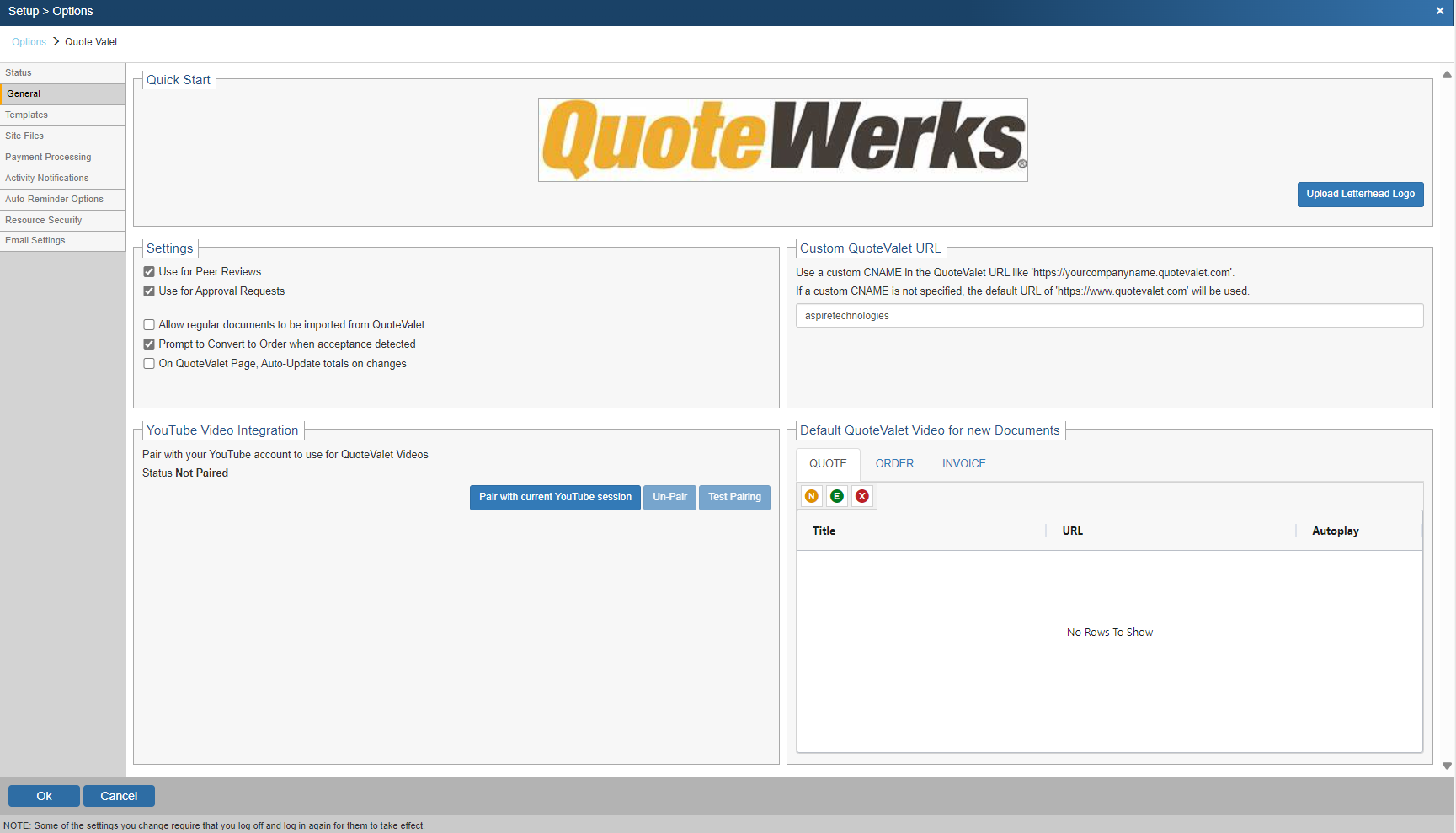 These settings enable users to set default single or multiple videos for new quotes, orders, and invoices created. This is very useful if you are looking to include videos on every document created such as information about your company, ordering instructions, etc. When these defaults are set, these videos will automatically be associated with any new quote, order, or invoice that is created in QuoteWerks. Users can remove them if needed, but will not have to remember to add them.