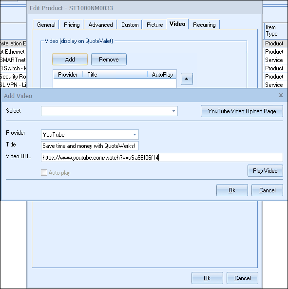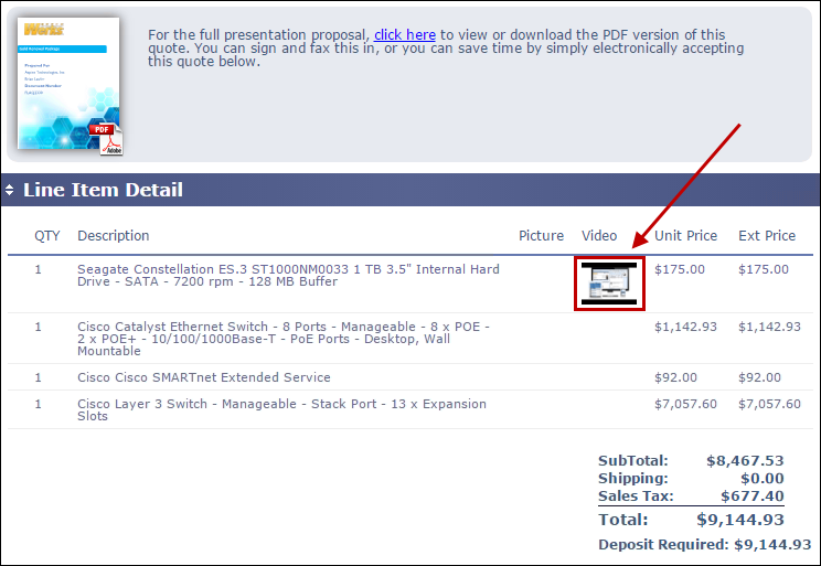 Now, whenever this item is added to a document, the video can be viewed on the QuoteValet page.
