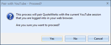 Important: When QuoteValet is paired with YouTube, these credentials are used by all users. This means that everyone that has the ability to attach videos, will have access to the YouTube videos for this user. It may be a good idea to create credentials specifically for QuoteWerks and not use a personal YouTube account. |
