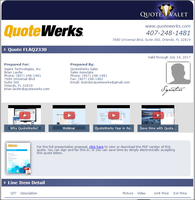 QuoteValet supports videos for any document uploaded to QuoteValet. The videos need to be uploaded to YouTube first and can then be displayed on the QuoteValet document. Single or multiple videos can be displayed for a document as well as videos for individual line items. QuoteValet also supports default videos for every type of document (quotes, orders, invoices) created in QuoteWerks so users do not have to remember to manually include videos on documents.