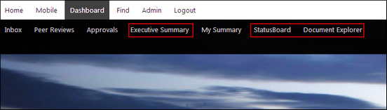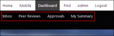 The Dashboard menu includes four options by default: Inbox, Peer Reviews, Approvals, and My Summary.