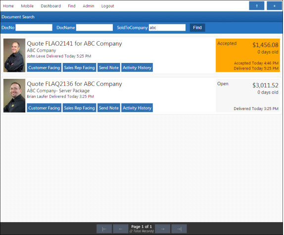 You can quickly locate a document uploaded to QuoteValet by clicking Find. Here, search for documents by document number (DocNo) and/or name (DocName) and/or the sold-to company name’s (SoldToCompany).