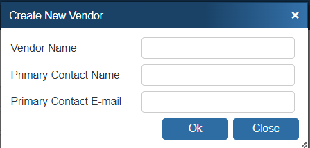 To create a new vendor select the New button and input the Vendor Name as well as the Primary Contact's Name and E-mail.