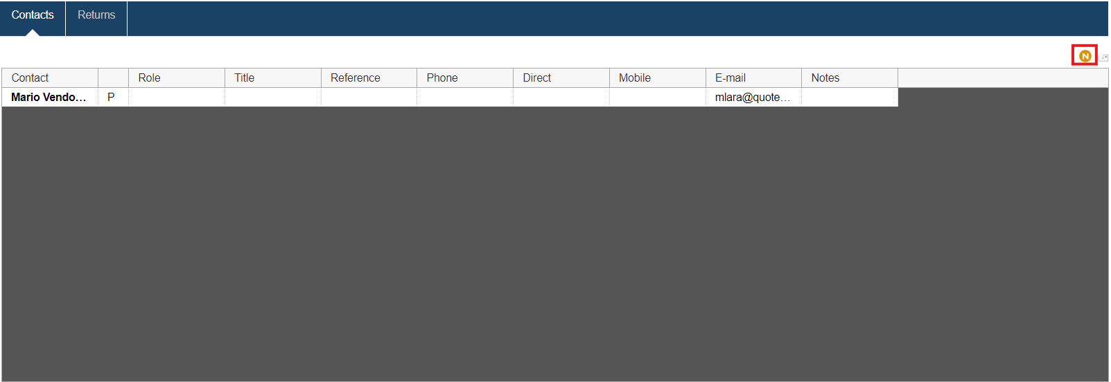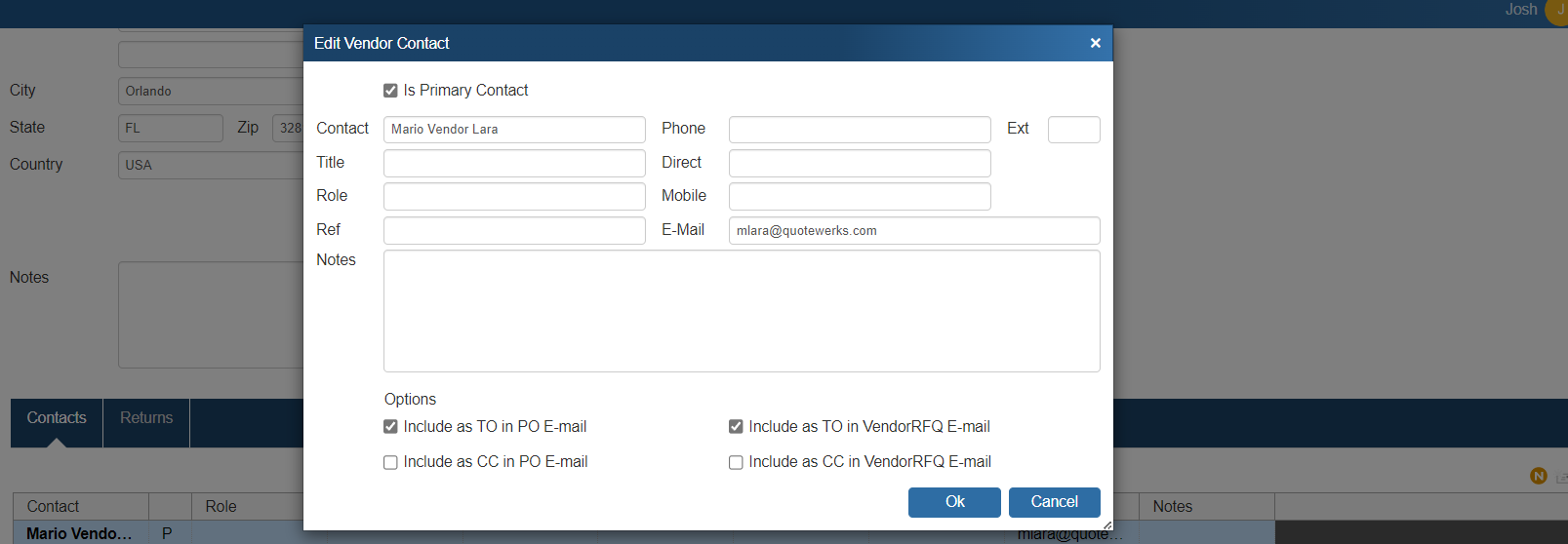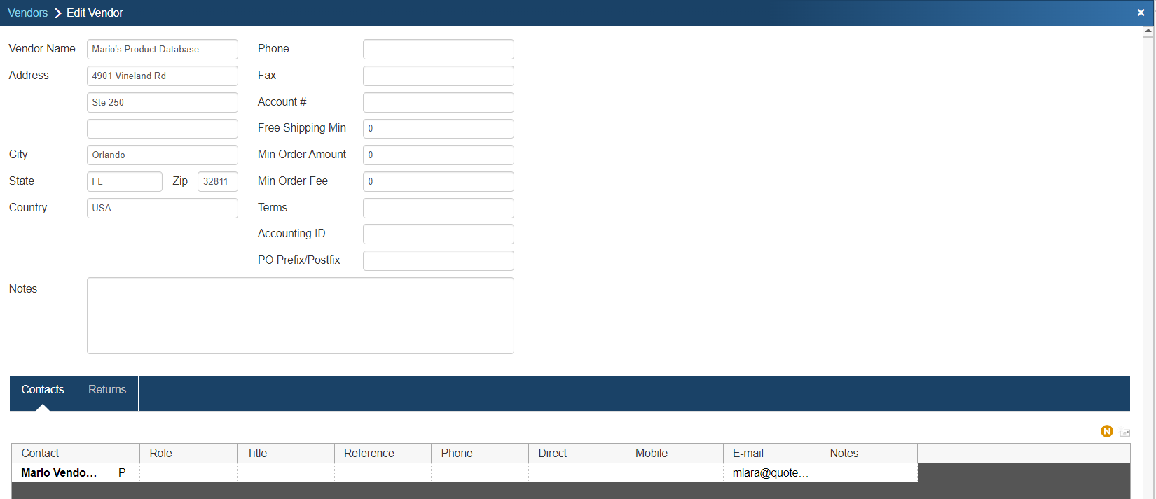 This window also displays Contacts you have saved for this Vendor. There is also a Returns tab which is explained in more detail below.