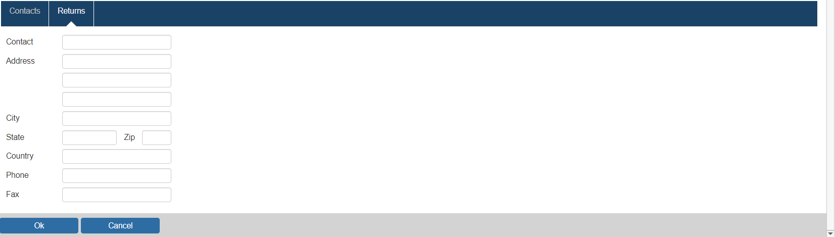The returns tab provides you with the ability to store contact and address information that can be used in the processing of returns or RMAs.