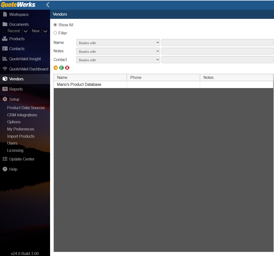 The Vendors page allows you to create, search for, and interact with your vendor profiles. You have the ability to show all vendors or to search using the Name, Notes, or Contact fields using standard operators.