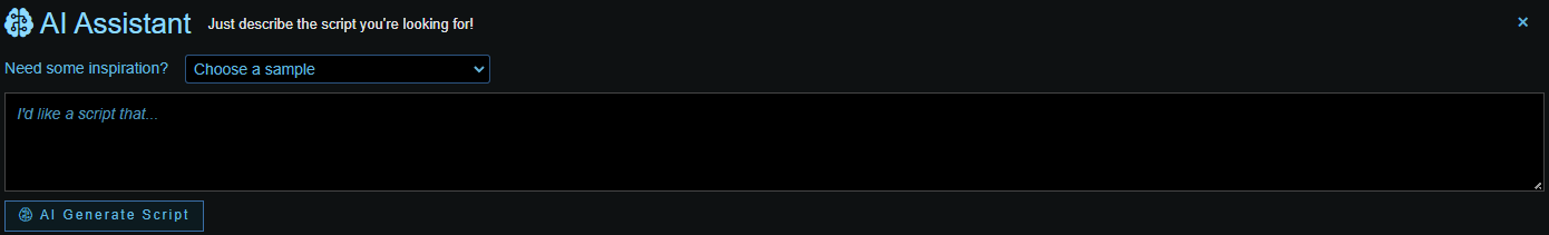 The AI assistant is available in the testing area and when an Event is selected. To open the AI Assistant click on the Brain icon. In the dropdown list next to ‘Need some inspiration’ are sample prompts that can be used to generate specific scripts. If you would like to use the AI Assistant to write a script simply input your prompt (what you want the script to do) and hit ‘AI Generate Script.’ As AI processes the input, activity is logged in the Scripting Log which can be toggled on or off. The output will then be inserted into the code editor from which you can run, save, or edit the AI output.